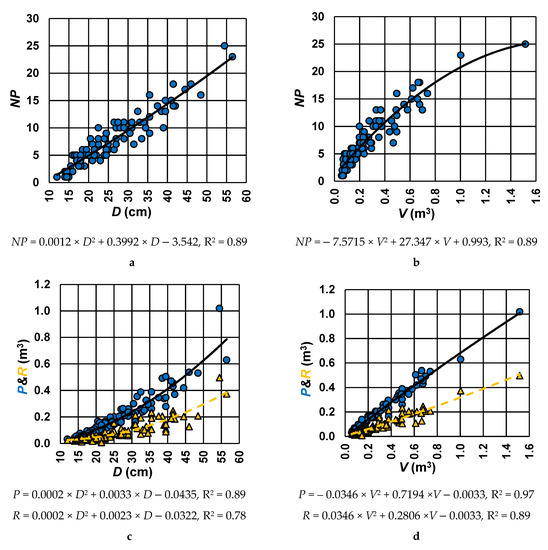 Dependence relations between the production variables and production inputs. Legend: (a) and (b)—number of produced pieces (NP) as a function of the average diameter (D) and log volume (V); (c) and (d)—volume of production (P) and residues (R) as a function of the average log diameter (D) and log volume (V).
