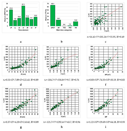 Time consumption models. Legend: (a,b)—shares on time consumption categories; (c)—time consumption models for log loading (tL); (d–f)—time consumption models for blade adjustment (tA); (g–i)—time consumption models for sawing (tS); D—average log diameter, V—log volume, NP—number of produced pieces.