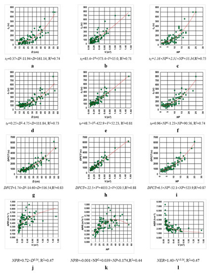 Time consumption and productive performance models. Legend: (a–c)—time consumption models of the lumber unloading (tU) as a function of the average log diameter (D), log volume (V) and number of produced pieces (NP); (d–f)—time consumption models of the lumber fixing (tF) as a function of the average log diameter (D), log volume (V) and number of produced pieces (NP); (g–i)—delay-free cycle time models (DFCT) as a function of the average log diameter (D), log volume (V) and number of produced pieces (NP); (j,k)—net productivity rate models as a function of average diameter of the log (D) and number of produced pieces (NP); (l)—net efficiency rate model (NER) as a function of the log volume (V).