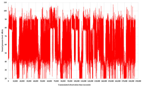 Variation in the time domain of the sound pressure level measured at 1 Hz for the six days of observation.