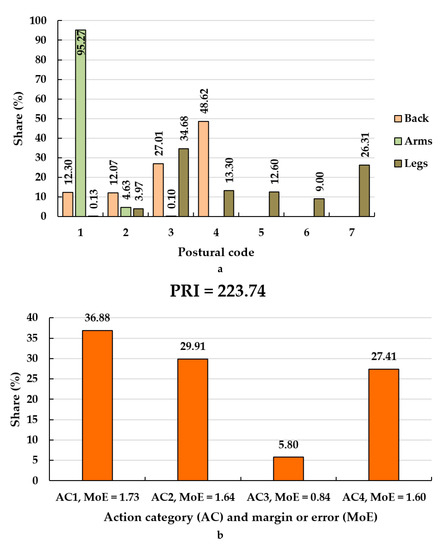 Results of postural analysis. Legend: (a)—relative frequencies of the back, arms and legs on postural codes; (b)—relative frequencies of body postures on action categories, the estimated postural index and margin of errors per action categories.