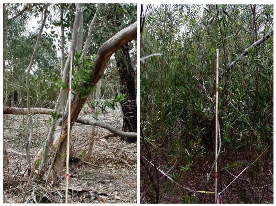 Fuel hazard ratings were measured for each plot using the Overall Fuel Hazard (OFH) Assessment Guide [], which is the standard approach used in the study area []. Four fuel strata (bark, elevated, near-surface and surface) are assessed separately and assigned a categorical fuel hazard rating (low, moderate, high, very high or extreme). The rating is based on a visual assessment of cover and continuity (horizontal and vertical) of dead and live fine fuel and some simple measurements such as surface fuel depth, which was measured 12 times within the plot, and the average height for elevated and near-surface fuels were also recorded as part of this assessment. An aggregate rating (overall fuel hazard) is produced by combining the visual assessments of the four fuel strata. This process was aided by the descriptions and images provided in the OFH Guidebook [] and by maintaining the same person for all assessments to remove observer bias [].
