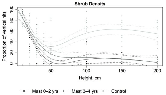 We used generalised additive models (GAMs) for the shrub density data, to fit a curve to show the trend in shrub vertical density for masticated versus control plots []. This modelling approach fits a smooth spline to allow the visualisation of trends in the data and prevents the need to make prior assumptions about the form of any trends. The GAMs were fit as cubic splines and we allowed a maximum of four degrees of freedom. In the fitting process, a penalty term was applied, which limited the complexity of the fit based on restricted maximum likelihood (REML) criteria.