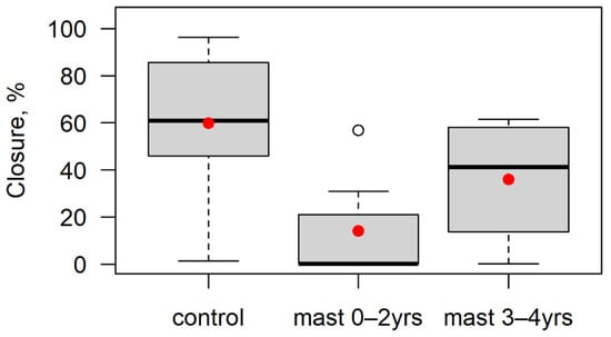 Boxplots of vegetation closure (%) measured from a height of 1.5 m for 0–2 years post mastication, 3–4 years post mastication and control. The mean is indicated by the red dot.