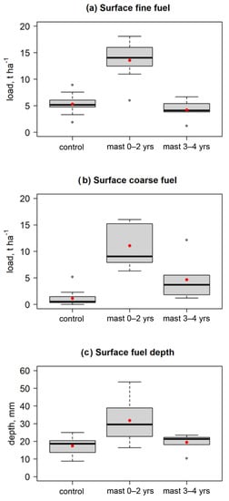 Box plots of dead surface fuel load (t haP−1P) for (a) dead fine fuels, (b) dead coarse fuels and (c) surface fuel depth (mm) for 0–2 years post mastication, 3–4 years post mastication and control. The mean value is depicted by the red dot.