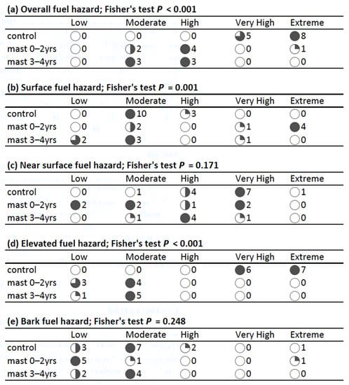 Contingency tables showing the number of times each fuel hazard category was recorded in each treatment for (a) Overall fuel hazard; (b) Surface fuel hazard; (c) Near-surface fuel hazard; (d) Elevated fuel hazard; and (e) Bark fuel hazard. Pie charts provide a visual indicator of the relative frequency of occurrence of each hazard class within a treatment class.