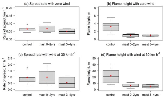 Box plots showing predicted forward rate of spread (km h−1) for (a) zero wind and (c) 30 km h−1 wind speeds and flame height (m) for (b) zero wind and (d) 30 km h−1 wind speeds for 0–2 years post mastication, 3–4 years post mastication and control. The means are indicated by a red dot.