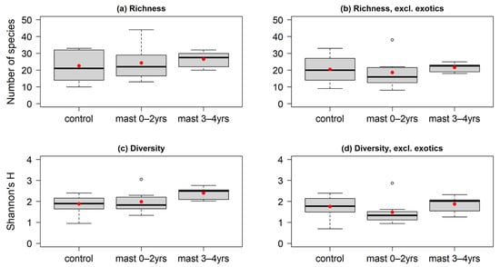 Floristic diversity metrics for (a) species richness; (b) species richness excluding exotic species; (c) Shannon’s H’ and; (d) Shannon’s H’ excluding exotic species for 0–2 years since mastication, 3–4 years since mastication and control.