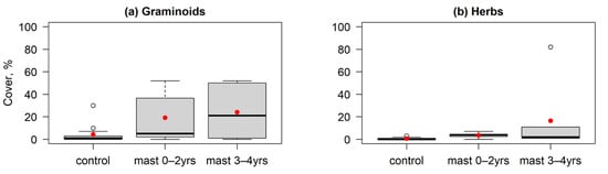 Cover abundance of exotic species: (a) graminoids; and (b) herbs for 0–2 years post mastication, 3–4 years post mastication and control.