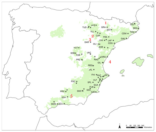 Map including the sampling locations (for a description of the site codes, see Table S1). Shaded areas correspond to the actual Pinus halepensis distribution, obtained from the National Institute for Agricultural and Food Research and Technology (www.inia.es, accessed on: 25 April 2021). Numbers refer to different toponyms: (1) Pyrenees, (2) Ebro Valley, (3) Iberian System, (4) Mediterranean Sea, and (5) Betic and Penibetic Mountains.