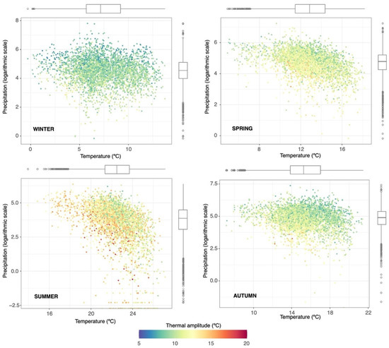 Seasonal variability of the temperature and precipitation. Dots represent the average seasonal values at the grid points covering the study area. Color scale indicates the difference between the maximum and minimum temperatures. Boxplots summarize the frequency of the temperature and precipitation for each season.