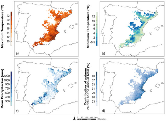 Climate characteristics of the study area. (a) Maximum temperatures, (b) minimum temperatures, (c) mean annual precipitation, and (d) percentage contribution of autumn precipitation to the total precipitation.