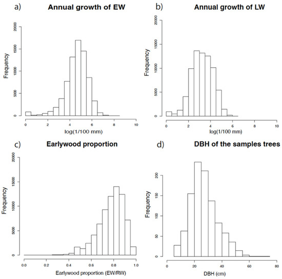 (a) Annual growth of EW. (b) Annual growth of LW (a,b) There were 73,238 annual growth values from 139,634 growth rings—2 per tree overall. (c) Earlywood proportion (EW/RW). (d) DBH of the sampled trees (1026 trees).