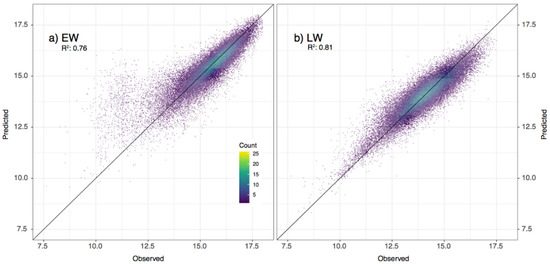 The full models of EW and LW were then applied to the observations, and we performed a comparison between the observations and their corresponding predictions to evaluate their goodness-of-fit (Figure 5). The results showed a good agreement, with coefficients of determination of 0.76 and 0.81 for EW and LW, respectively. No general bias was observed in both sets of predictions, except for a slight overestimation of a few observations in EW lower than 12.5. Despite the inherent limitations related to models’ uncertainties, the applicability of the obtained models all across the distribution area was possible given the agreement between the predicted and observed wood measurements. However, the results were applicable to the studied species in the study area and should not be extrapolated to other species or sites.