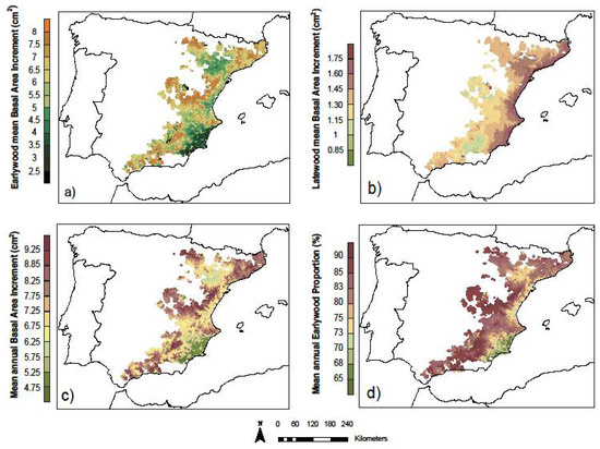Finally, RW width is conditioned mainly by EW width (Figure 6d). Although the LW growth was high in the dry and warm areas at the SE of the peninsula, it did not exceed 65% of the total basal area increment in any case, with most of the territory having values above 80% (Figure 6a,b). This means that the total growth and the EW growth showed practically similar spatial patterns, with lower average annual growths at the SE and the central sector of Ebro Valley, where low rainfall at any time of the year together with high summer temperatures had a significant effect on growth, while the highest growth rates, 120% higher, were observed in areas with milder temperatures due to their higher altitudes and better orientation to oceanic flows that ensured greater volumes of precipitation during the spring.