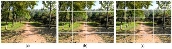 Superpixel initial segmentation effect diagram based on the image collected by the CCD monocular vision camera. (a) Raw image; (b) Initial segmentations with 4 × 4; (c) Initial segmentations with 6 × 5.