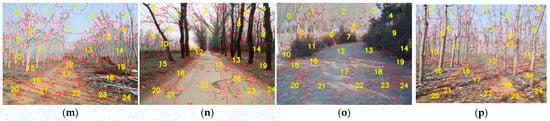 To ensure the validity and reliability of the algorithm, we collected as many different roads as possible. Figure 6 shows the effect of the superpixel segmentation. The number (0–24) in each image in the figure is the label of each superpixel. Figure 6a–f are from the RUGD public dataset. Figure 6g–k are from the Jiufeng Forest Farm of Beijing Forestry University. Figure 6l–p are from the Shandong Liaocheng Forest Farm Test Base. Figure 6a–k are summer road scenes, and Figure 6l–p are spring and autumn road scenes. The figures contain a variety of unstructured roads in forest areas, where Figure 6a,c,f are wet dirt roads. Figure 6l–n are dry dirt roads. Figure 6b,d are gravel roads. There are shadows of trees on the road in Figure 6i,j. There are mostly weeds on the roads in forest areas in Figure 6a,e,g,h,i,k. There is a lot of humus on the road and roadside in Figure 6m,p. Figure 6 shows that the improved SEEDS algorithm proposed in this study can segment the road and non-road areas accurately and has a good superpixel segmentation effect under various complex road conditions.