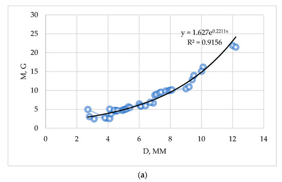 According to the elaborate methodology, the research determined both the amount of total dry biomass and the amount of bark, because the bark could have energetic properties different to that of wood. First, the dry mass of each twig extracted as a sample from the total samples was determined, depending on their diameter measured at 100 cm from the ground. The value of the Pearson R2 determination coefficient was taken into account, choosing the highest value, i.e., in the case of Figure 6 the coefficient was R2 = 0.91 for bark, and was R2 = 0.99 for wood). Among the linear, exponential, logarithmic, polynomial and power approximations, it was found that the exponential function has the highest predictability of values.