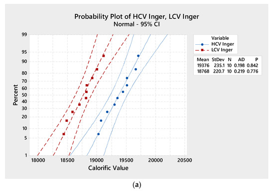 The graph in the previous Figure 8 was made for an error of 0.05 and a normal distribution of values. The framing of the experimental values between the two control limits shows us the normality of the distribution once again, but the best element is the Anderson–Darling (AD) parameter with values of 0.198/0.219 in the case of Figure 8a and 0.557/0.206 in the case of Figure 8b, these values being higher than the error taking into account of 0.05. By taking into account the 95% confidence interval (for ±2 s, where s is the standard deviation of the values determined using the Minitab 18 program) and the arithmetic mean, it was possible to determine the limiting intervals of the calorific value, as follows: