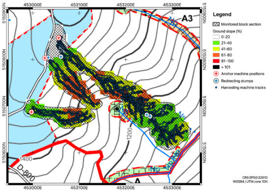Figure 1). During winch-assist harvesting, the trees were mostly felled facing downhill, piling trees into bunches in order to optimize the subsequent cable yarding operations. During the observation period, three different anchor machine positions were used. Because of the ground morphology and anchoring location, the tethered machine also employed four redirecting stumps where the cable was oriented on one side of a robust stump, providing lateral deflection and allowing the harvesting machine to operate more effectively on the alternate aspect slopes. Various rub trees were also used in case of more limited deviations.
