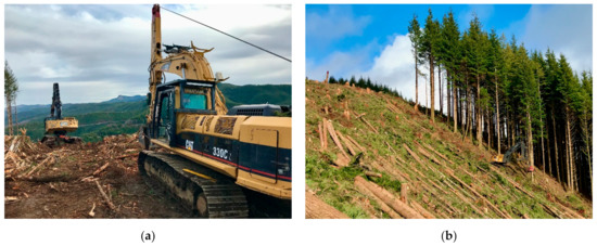Figure 3a) and in one occasion led to a SWL exceedance. The same effect was also recorded, for example, during downhill-facing hoe-chucking, where (similarly to felling) the weight of the trees lifted by the harvesting machine led to tipping and increased stress on the cable (