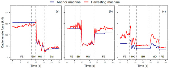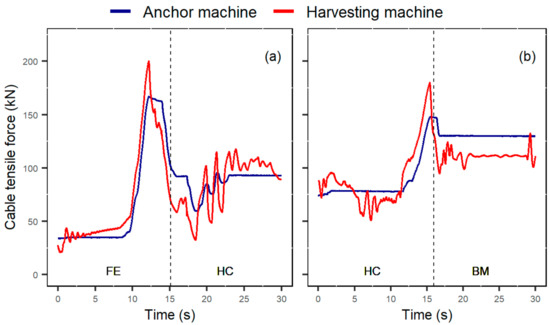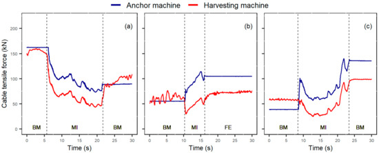 Figure 6a). When the initial tensile force at the anchor machine was lower than that of the low displacement mode’s pulling capacity, the harvesting machine still recorded a drop in the cable tensile forces, but the anchor machine recorded a sharp increment (