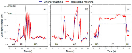 Figure 5a,b)—reaching the maximum working load recorded in the observation (41.6% of the MBS)—and exceeding the SWL at both the harvesting and anchor machine. Moreover, even though stationary work elements were responsible for the majority of the time exceeding SWL at the harvesting machine, this was mostly linked to limited increments of the high tensile forces due to previous movements of the harvesting machine (moving-out) and their interaction with pedal controls and threshold settings (