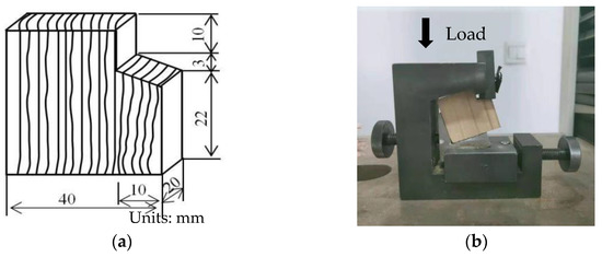 In total, 40 notched specimens as described in Section 2.1 were prepared in the RL system (Figure 1). The shear strength was measured according to GB/1937-91. The test was carried out at a uniform rate, and the test specimen was destroyed within 90–120 s. Before measurement, the number and width of the annual rings were measured on the transverse face of the butt end of the samples.
