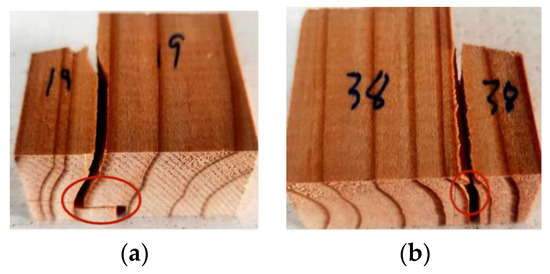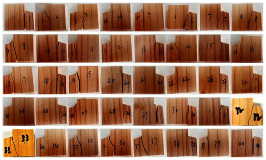 Figure 2 shows the failure modes for 40 shear samples. Most specimens had gentle fractures without obvious zigzags. It was rare for cracks to propagate from one growth ring to another. If the failure began with earlywood, the crack propagated until it reached the boundary between earlywood and latewood, or when it ended at earlywood. The initial failure position occurred at the junction between earlywood and latewood. The crack did not laterally propagate and rather always extended at the junction of earlywood and latewood until the specimen was completely destroyed. In addition, the fracture surface of the specimen was not a complete surface. When the crack extended to the location of wood rays, the crack expanded along the wood rays to the junction in the earlywood and latewood of the next growth ring (Figure 3). However, this failure mode only appeared in 2 out of 40 samples in this study (samples 19 and 38). The destruction of the other samples occurred in a single growth ring. We do not fully understand the reasons behind the obtained result, but we have not ruled out that there was an incorrect sample texture.