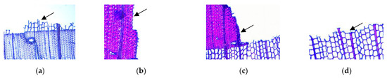 The cross section of the failure site was observed under a light microscope. The results indicated that the failure section of earlywood had more damaged cells and that the complete cell wall cannot be observed in Figure 4. The destruction of the junction between earlywood and latewood was not completely separated at the growth ring; usually, one to three earlywood cells adhered to the latewood (Figure 4a), which was similar to Ren’s finding [23]. Similarly, the earlywood cells at the failure location were incomplete cells (Figure 4a,d). For the destruction of latewood, the cells still retained their cell morphology under a light microscope after destruction (Figure 4b). This indicated that under longitudinal shear stress, cells with thick walls were destroyed between S1 and S2, or in the intercellular layer. When the crack expanded to the wood ray site, there was no obvious ray cell fragment (Figure 4c).