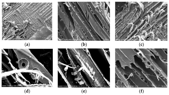 The sectional morphology of wood was observed under SEM to specifically analyze the failure mode. The morphology of wood rays after stripping is shown in Figure 5a. Figure 5b shows tracheids cell tearing along the MFA in the S2 layer, wherein cracks can be observed from the failure surface in the earlywood position. When earlywood was destroyed, the cell destruction mode had a tearing failure (Figure 5c). Torn cell wall fragments that spiraled out of the fractured tracheids indicate a ductile character in the fracturing process. In Figure 5e, large MFA in the S1 layer, as well as the brittle fracturing of latewood cells were shown. Cell damage in latewood in Figure 5f showed a difference from the tear damage of earlywood.