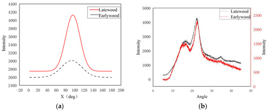 The above studies show that the structure of earlywood and latewood in larch determines the location and mode of shear failure; therefore, we examined the difference of density, crystallinity, and MFA between earlywood and latewood in L. kaempferi. As shown in Figure 6, the diffraction peaks of earlywood and latewood in L. kaempferi were similar, but the diffraction intensity was different.