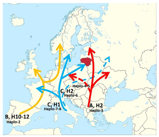 Simplified pathways of the main postglacial migration lineages of Q. robur based on [19] (noted by the capital letters A, B, C) and haplotypes as in [14] (noted by capital H) and our study (noted by Haplo). Haplo-4–5 indicates the “German” branch of the Balkan lineage A. The location of Lithuania on the map is highlighted.
