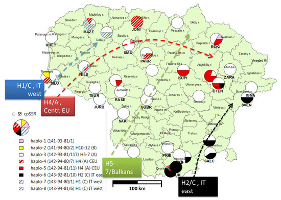 The geographical distribution of the remaining haplotypes, however, is less easy to explain by natural processes of migration alone. The first unexpected result under natural migration is a very compact concentration of the western Italian lineage C in the western highlands of Zemaitija. If considering natural migration of this haplotype northwards from Poland via south-western Lithuania, it should have entered Lithuania and spread over a much broader range from southern to western Lithuania. However, with a comparably dense sampling grid we were able to detect this western Italian lineage only in the very north-western part of the country. The second, seemingly odd geographical distribution concerns the “German” sub-branch of the Balkan lineage A. Based on the earlier studies [14,20], this sub-branch of the Balkan lineage arose somewhere in present-day Germany and we assume that it migrated from Germany north-eastwards into Lithuania. If considering a natural migration pathway, as with the western Italian lineage, we should be able to find more representatives of the “German” sub-branch of the Balkan lineage in the southern and central parts of Lithuania. However, this was not the case in our study.