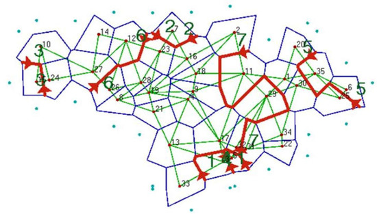 Results of the Monmonier’s algorithm modeling (the BARRIER software) of the geographical barriers for significant shifts in the allele frequencies based on the chloroplast microsatellite markers. The map shows a Delaunay triangulation plot between the sampled populations on a simplified map of Lithuania. The larger numbers at the barriers indicate the significance of the barriers with the 1st barrier being the most significant and the 7th barrier—least significant. The small numbers at the dots indicate populations.