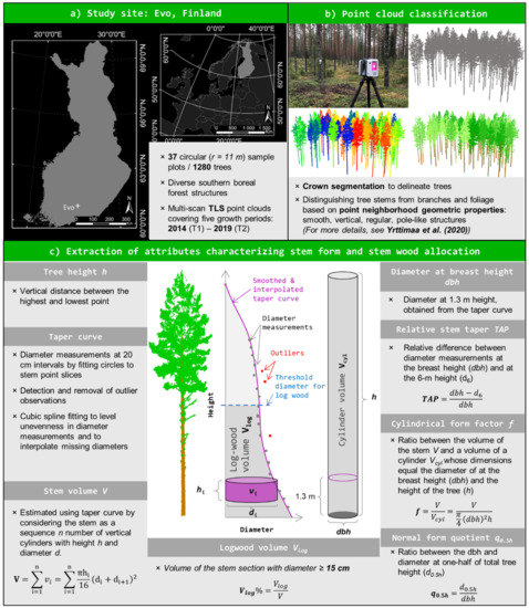 Changes in the stem wood allocation were quantified in more detail with attributes that characterize changes in V and logwood volume (Vlog). The Vlog was estimated as the volume of the stem section with diameter ≥15 cm using the taper curve. Compared to V, the Vlog is expected to be less prone to uncertainties in the point cloud-based tree measurements as it represents the bottom section of the stem (see Figure 1) which is usually more directly visible to the scanner than the upper part of the stem that often remain occluded by branches [30,40]. Proportion of Vlog to V was computed to obtain logwood volume percentage (Vlog%) which was used to be able to compare stem wood allocation between different-sized trees. The point cloud-based estimates for V, Vlog, and Vlog% were obtained at both time points. To make the change in V and Vlog comparable between different sized trees, relative stem volume increment (ΔV) and relative logwood volume increment (ΔVlog) were used in the analyses of this study. Relative increments were determined by subtracting the attributes estimated at T1 from the attributes estimated at T2 and dividing the result of subtraction with estimated attributes at T1. The change in logwood percentage (ΔVlog%) was quantified in percentage points by subtracting the attributes estimated at T1 from the attributes estimated at T2.
