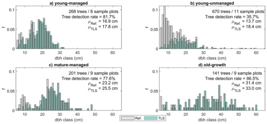 Diameter at breast height (dbh) distributions for each forest structural group. The bars represent the relative frequency (f) of trees in each dbh class based on field measurements (Ref.) with dark coloring referring to the proportion of trees that could be detected from the terrestrial laser scanning (TLS) point clouds both at the beginning and at the end of the monitoring period. For comparison, the mean dbh values (μ) for the field-measured and TLS-derived trees are provided for each forest stand class alongside the number of trees and sample plots as well as the overall tree detection rate.