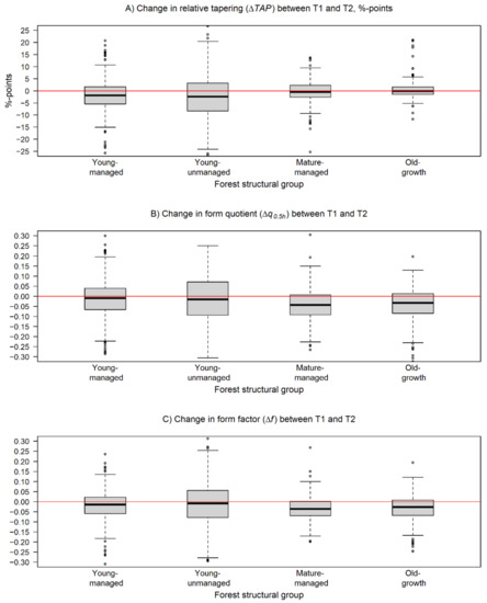 Box and whiskers plots describing the variation in the changes of the estimated (A) relative stem tapering (ΔTAP), (B) normal form quotient (Δq0.5h), and (C) cylindrical form factor (Δf) during the monitoring period within the forest structural groups. The black line represents the median of the change, and the box borders show the lower and upper quartile of the variation. The whiskers are used to indicate 1.5 times the interquartile range from the upper and lower quartiles. The changes in TAP are presented in percentage points while changes in q0.5h and f are presented in absolute units. The horizontal red line is equal to no change.