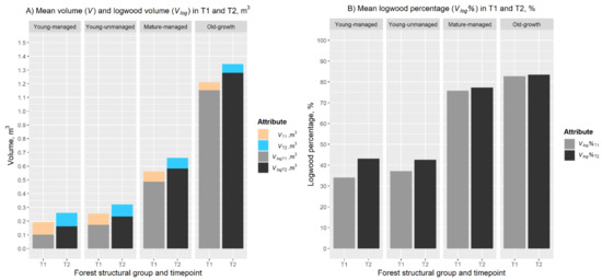 (A) Mean stem volume and logwood volume of trees in different forest structural groups in T1 and T2. The bars represent the mean stem volume (V, m3) and mean logwood volume (Vlog, m3) in T1 and T2 within forest structural groups young-managed, young-unmanaged, mature-managed, and old-growth, respectively. (B) Mean logwood percentage (Vlog%, %) in T1 and T2 within the forest structural groups used in the study.