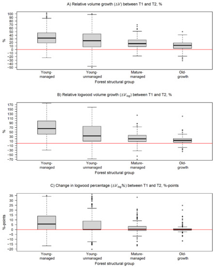 Box and whiskers plots describing the variation in change of the estimated stem volume attributes within the forest structural groups during the monitoring period. In the plots, the black line represents the median of change and the box borders show the lower and upper quartile of the variation. The whiskers are used to indicate 1.5 times the interquartile range from the upper and lower quartiles. In (A), the relative change in stem volume (ΔV) and, in (B), the relative change in logwood volume (ΔVlog) are presented in percentages. In (C), the change in logwood percentage of tree stems (ΔVlog%) is reported in percentage points. The horizontal red line is equal to no change.