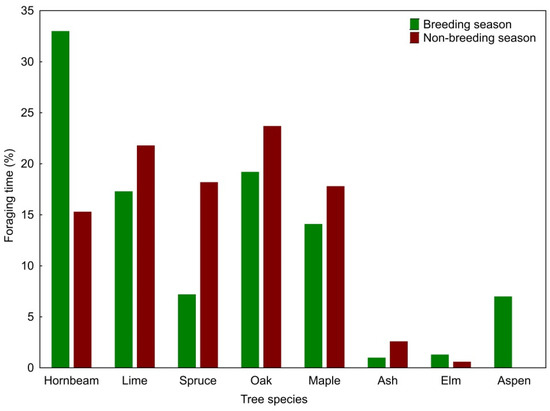 The Middle Spotted Woodpecker foraged on eight tree species during the breeding season and on seven tree species during the non-breeding season. The use of tree species (expressed as a percentage of foraging time) differed between the seasons (G = 23.63; df = 7; p = 0.001). In the breeding season, woodpeckers foraged most frequently on European hornbeams (33% of the observation time), but they also spent a significant percentage of the foraging time on pedunculate oaks, small-leaved limes, and Norway maples (Figure 1). The selection indices showed a significant preference for pedunculate oaks, Norway maples, common aspens and European hornbeams, while avoidance for small-leaved limes and Norway spruces (Table 1). In the non-breeding season, the Middle Spotted Woodpecker frequently foraged on pedunculate oaks, small-leaved limes, Norway spruces, Norway maples and European hornbeams, but pedunculate oak and Norway maple were the only tree species for which the selection indices showed a statistically significant preference (Table 1).