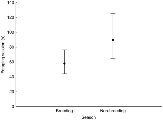 Least squares means with 95% confidence limits (from the statistical model presented in Table 3) of the duration of a foraging session of the Middle Spotted Woodpecker in breeding season and non-breeding season.