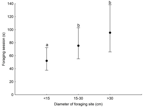 Least squares means with 95% confidence limits (from the statistical model presented in Table 3) of the duration of a foraging session of the Middle Spotted Woodpecker at sites with different diameters. Different letters indicate significant differences between different categories of foraging.
