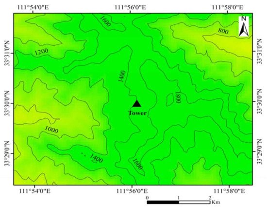 Flux tower was installed at an altitude of 1410.7 m, with a slope of less than 15° (33°29′59″ N, 111°56′07″ E) (Figure 2). We set up a 1-hectare plot centered around the flux tower and conduct vegetation survey in 2014. Quercus aliena was the dominant species in the natural oak forest ecosystem. Lindera obtusiloba, Meliosma flexuosa, Tilia nobilis, Corylus chinensis, and Tilia tuan were also distributed in the stand. The average height of trees in the plot was 18 m, while the average diameter at breast height (DBH) was 19.8 ± 2.8 cm in 2014. Shrubs included Lonicera hispida, Viburnum betulifolium, Sambucus williamsii, Forsythia suspensa, Spiraea dasyantha, and Litsea tsinlingensis.