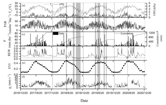 Temporal dynamics of (a) daily mean air temperature (Ta) and water vapor pressure deficit (VPD) at 22 m, (b) daily cumulative photosynthetically active radiation (PAR, molm−2day−1), (c) daily and cumulative precipitation (P), (d) relative extractable water content (REW), (e) 16-day composited MODIS EVI, (f) surface conductance (gs). Gray-shaded bands in plot indicate dryness stage.