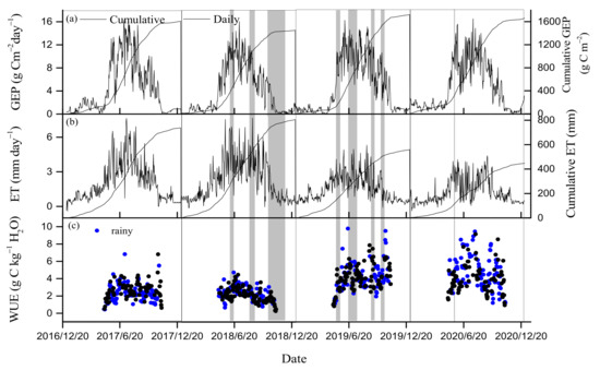 Temporal fluctuations of (a) daily and cumulative gross ecosystem production (GEP), (b) daily and cumulative evapotranspiration (ET), and (c) daily ecosystem water use efficiency (WUE) from 2017 to 2020. Blue circles denote rainy days greater than 2 mm in growing seasons. Gray-shaded bands in plot indicate dryness stage.
