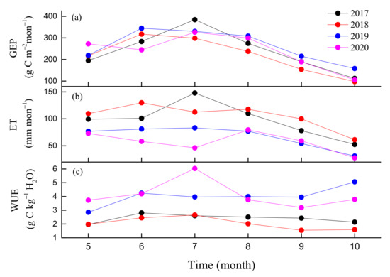 In contrast, daily WUE did not show a significant seasonal pattern (Figure 4c). Daily WUE varied between 0.25 and 9.8 g Ckg−1 H2O over the 4 years. The summer drought of 2019 increased WUE obviously, while autumn drought decreased WUE in 2018. Daily WUE values in 2019 and 2020 were obviously higher compared to those of 2017 and 2018. The maximum monthly WUE occurred in June, July, October and July during the four years, respectively (Figure 5c). The means of the daily WUE values during the four growing seasons were 2.5 ± 1, 2.2 ± 0.8, 4.2 ± 1.6 and 4.3 ± 1.8 g Ckg−1H2O from 2017 to 2020, respectively. The 4-year mean of annual WUE was 2.6 ± 0.68 g Ckg−1H2O, with a CV of 26.4%. Furthermore, daily GEP and ET during the growing season showed clear positive linear correlation from 2017 to 2020. The slope of this relationship can be used to express ecosystem WUE [54]. The slopes were 1.97, 1.5, 2.31 and 2.51, respectively, with higher values in 2019 and 2020 compared to those in 2017 and 2018 (Figure 6).
