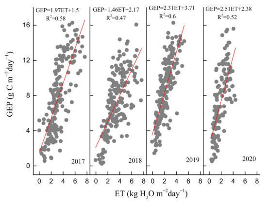 Relationship between daily gross ecosystem productivity (GEP) and evapotranspiration (ET) during the growing seasons from 2017 to 2020.