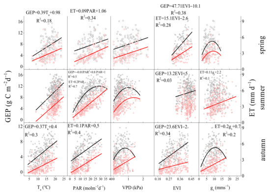 Relationships of daily gross ecosystem productivity (GEP), evapotranspiration (ET) with daily environmental factors (Ta, PAR, VPD) and biological factors (EVI, midday gs) in three seasons (spring, summer, autumn) from 2017 to 2020.