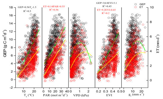 Relationships of daily gross ecosystem productivity (GEP), evapotranspiration (ET) with daily environmental factors (Ta, PAR, VPD) and biological factors (EVI, midday gs) in all of the growing seasons from 2017 to 2020.
